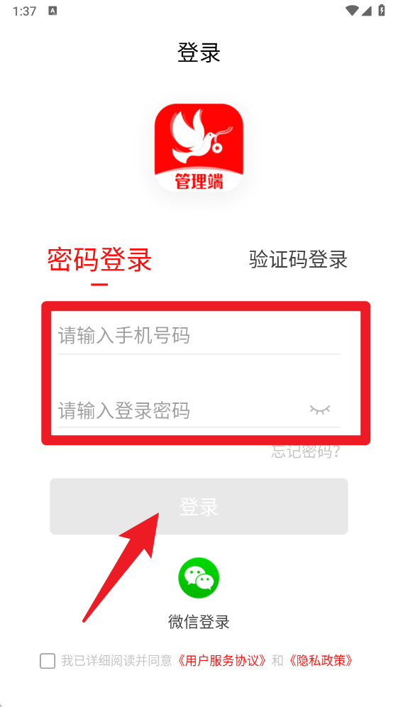 2、在登录界面,可选择输入手机号+密码登录,或直接使用微信账号登录。