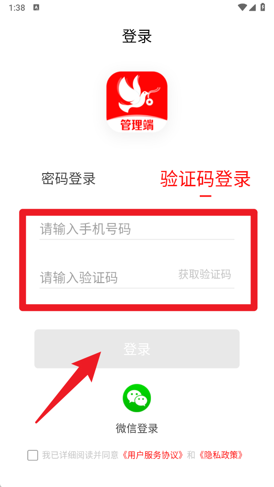 3、如使用验证码登入,可输入手机号点击获取验证码,输入验证码进行登入。