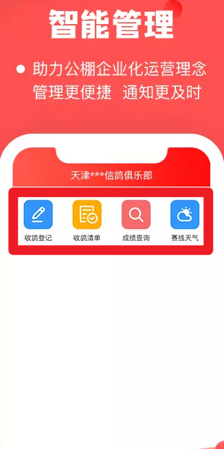4、进入智能管理,可使用收鸽登记、收鸽清单、成绩查询、赛线天气等常用功能。