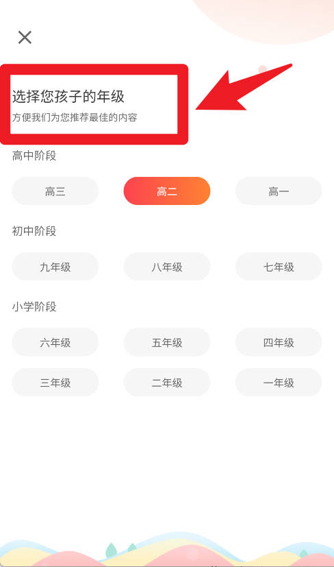 3、使用时需选择孩子所在年级,从小学到高中各个年级均覆盖,系统会根据年级自动推荐最优质的学习资源。