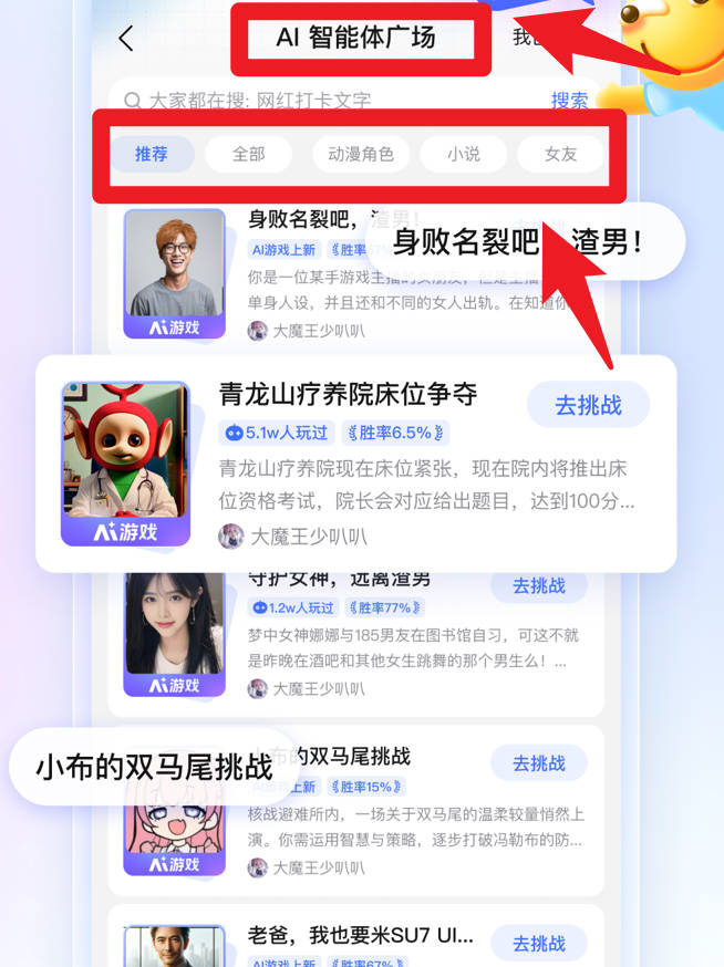 3、进入AI智能体广场,可以浏览推荐内容,包括动漫角色、小说等不同主题,参与各种趣味互动和挑战活动。