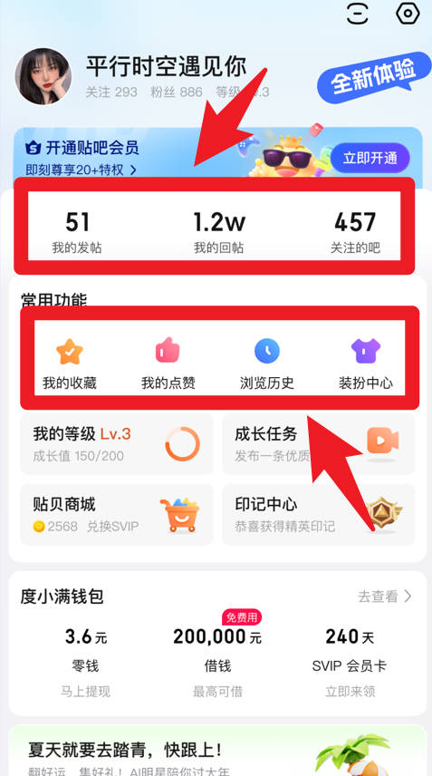 5、进入个人页面后,可以查看我的收藏、浏览历史和装扮中心,全面管理自己的贴吧内容和个性化设置。