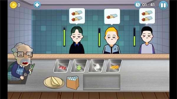 3、【简单玩法】采用轻量化、易上手的模拟经营玩法,无需复杂操作。一键化身沙威玛店老板,从接待客人、记录订单,到制作餐品、收取金币,全程流程清晰。通过完成服务任务赚取更多金币,解锁新功能与升级权限,轻松享受经营乐趣。