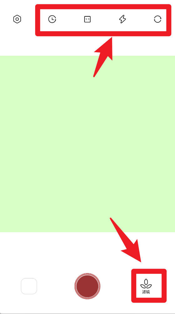 1、在拍摄界面,可以使用顶部的功能键调整拍摄参数,例如闪光灯和摄像头切换,可以点击滤镜按钮添加效果。
