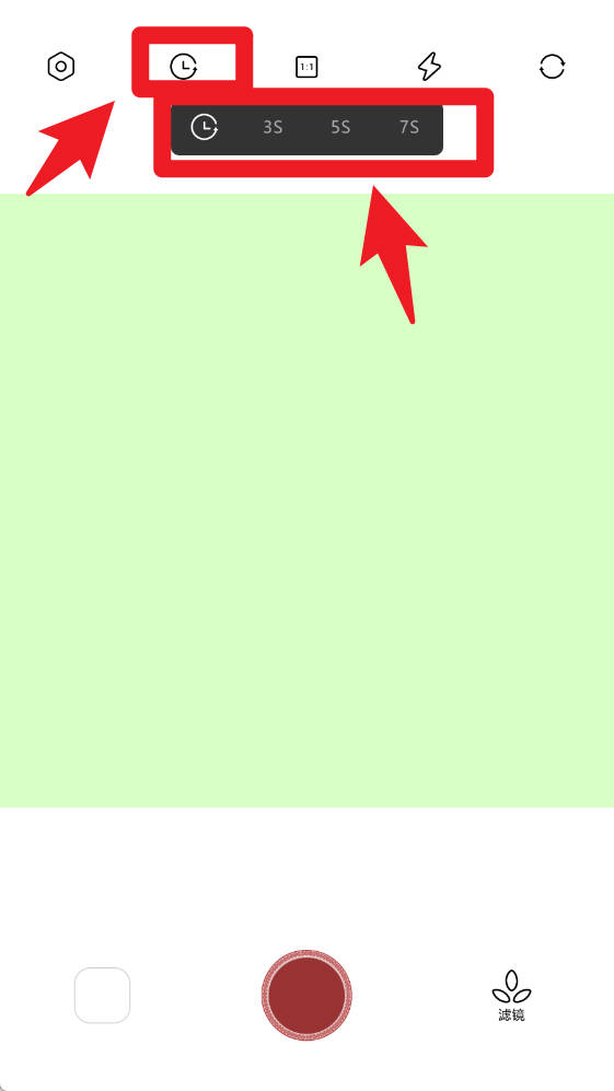 2、点击定时器图标,用户可以选择3秒、5秒或7秒延时拍摄,方便单人拍摄或摆好姿势后自动完成拍摄。