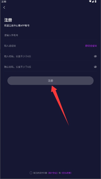1、在注册界面输入手机号和验证码,设置登录密码并勾选同意协议后点击注册。