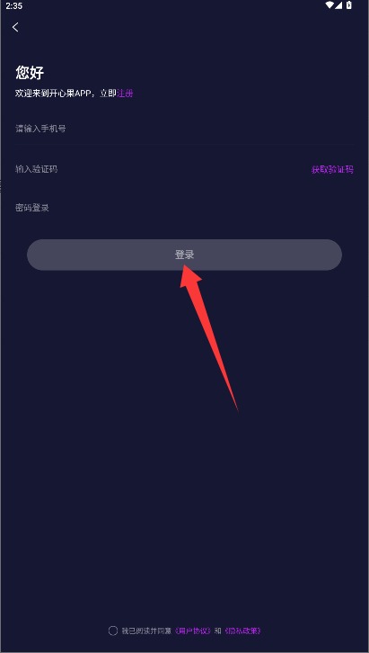 2、在登录界面输入手机号和验证码及密码,勾选同意协议后点击登录进入。