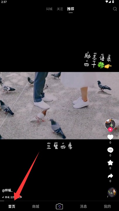 3、进入首页可浏览推荐短视频内容,通过上下滑动屏幕切换不同视频观看。
