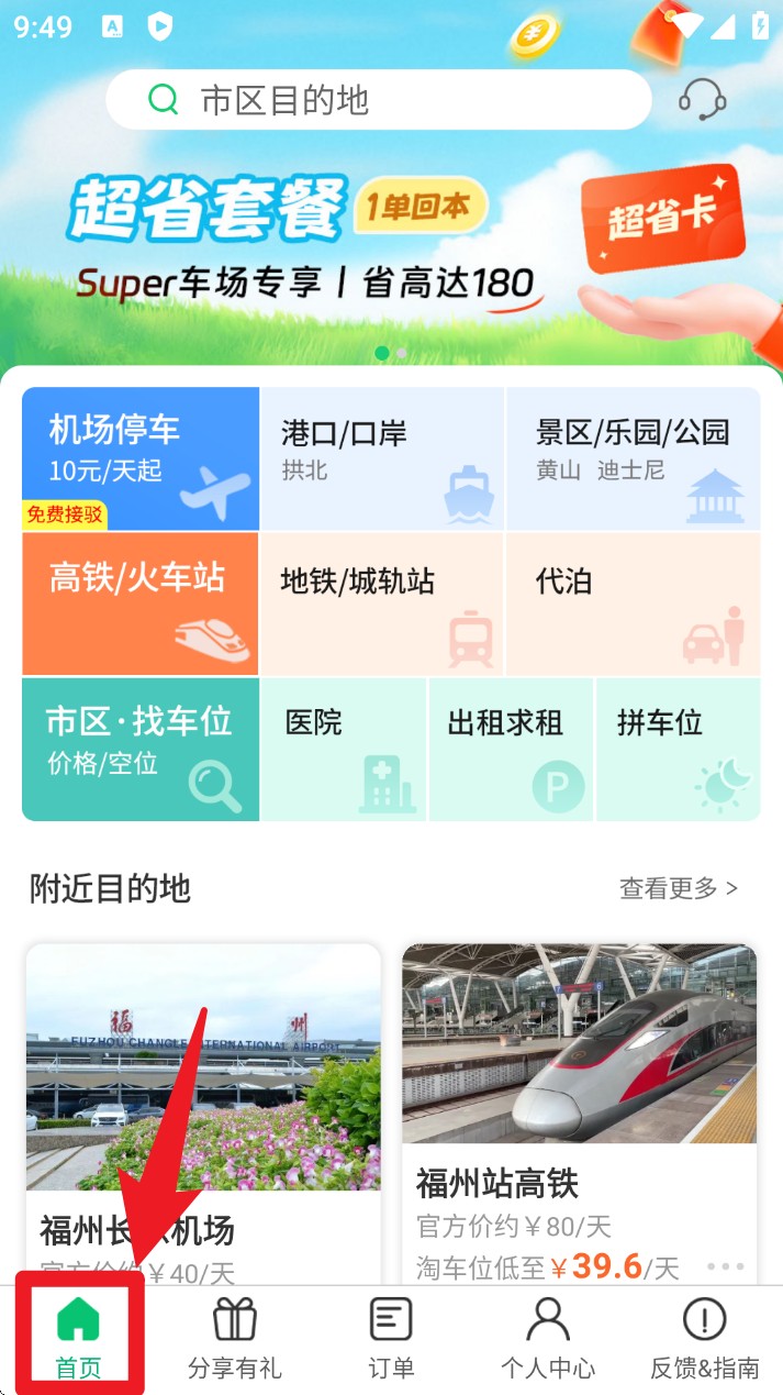 1. 打开App进入首页,可在搜索框输入目的地,或直接点选机场停车、市区找车位等分类开始查找车位。