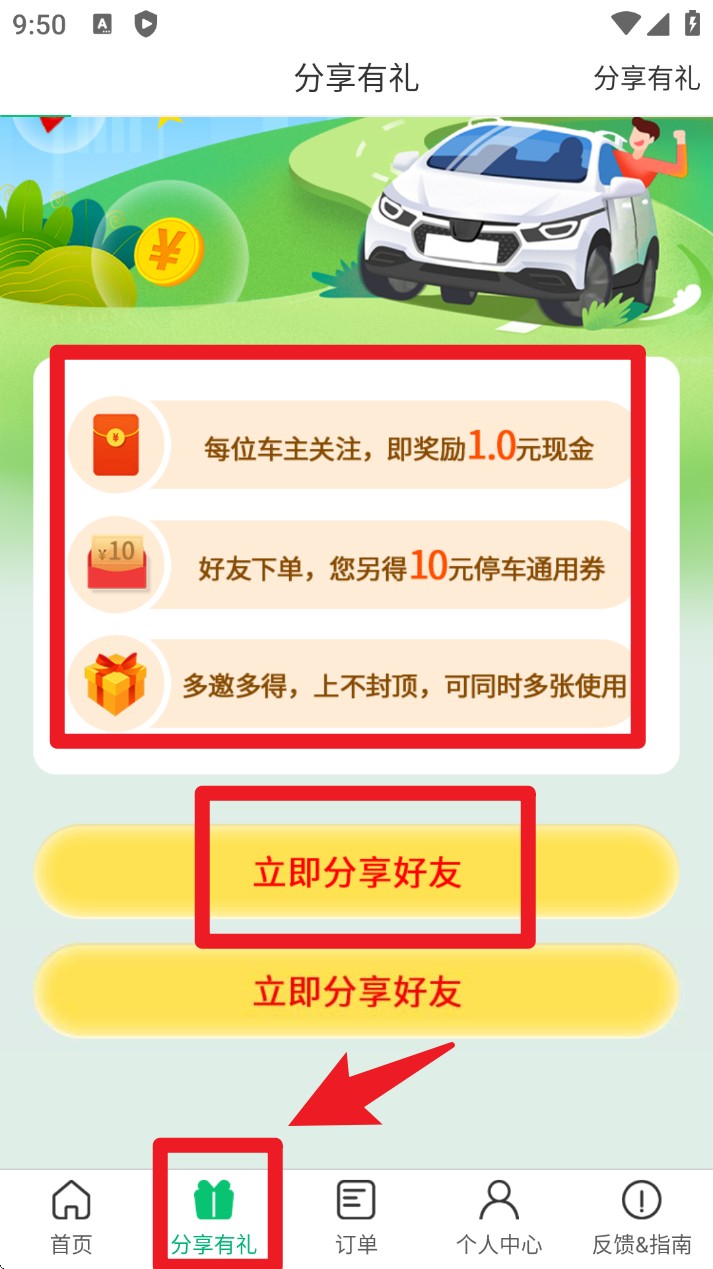 4. 点击底部导航栏分享有礼,可邀请好友注册停车位,好友下单后你将获得奖励停车券与现金红包。