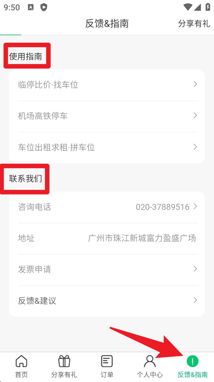 5. 如需查看帮助或联系客服,在底部导航点击个人中心并进入反馈指南,可查看使用指引、开票地址等信息。