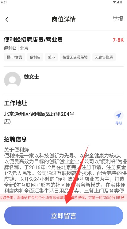 4、查看岗位详情中的工作地址和具体要求,点击立即沟通即可联系雇主咨询。