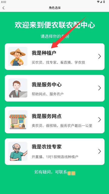 3、根据实际身份选择种植户或农技专家等角色类型,进入对应的详细注册流程步骤。