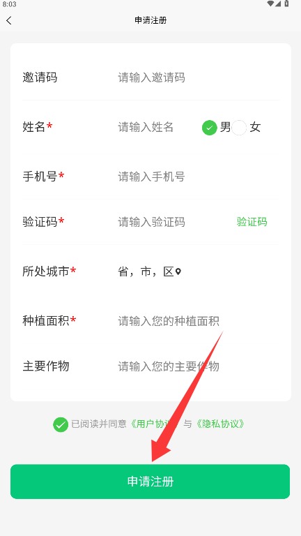 4、填写完整邀请码信息、个人详细资料及农业相关数据,确认无误后提交注册申请操作。