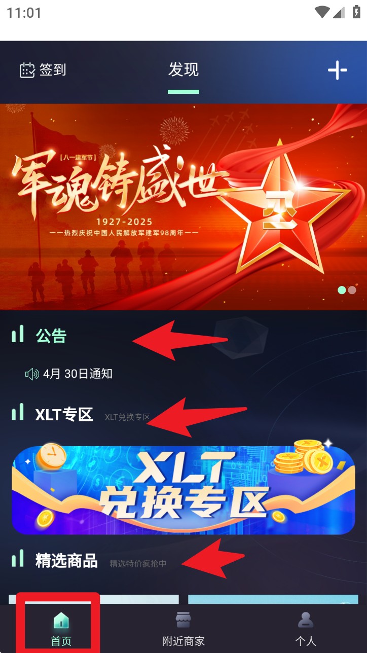 1. 进入首页后,点击XLT专区进入兑换页面,可浏览当前热门兑换商品和最新公告内容。