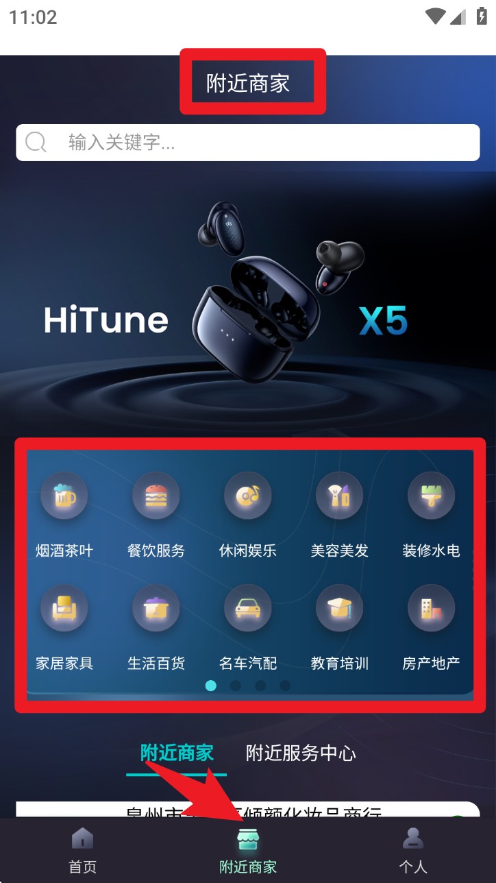 3. 切换至附近商家页面,即可根据分类快速查找本地生活服务,如餐饮、家居、教育等门类。