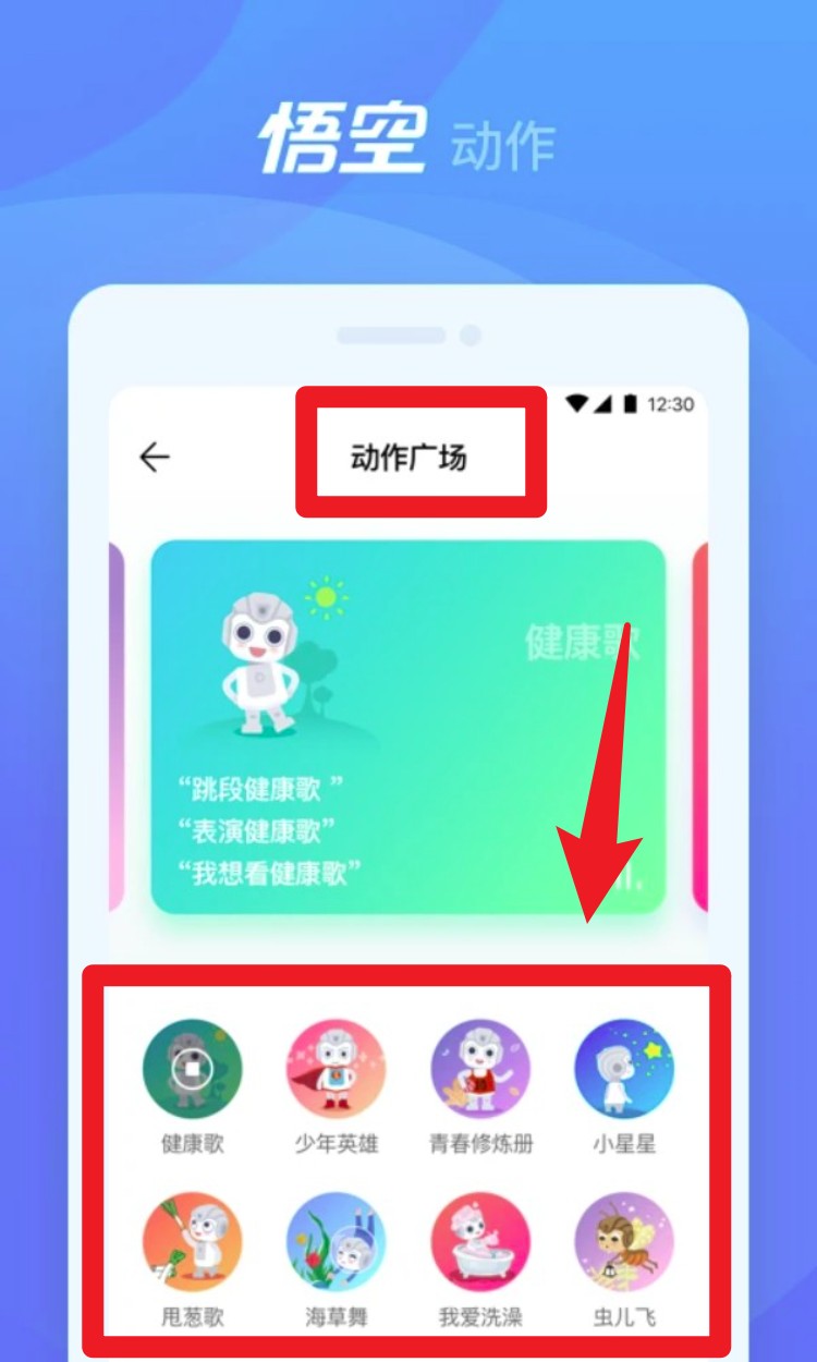 1. 进入首页点击动作广场,可选择如《健康歌》等动作歌曲,让机器人跟着节奏舞动,陪伴孩子一起活动身体。