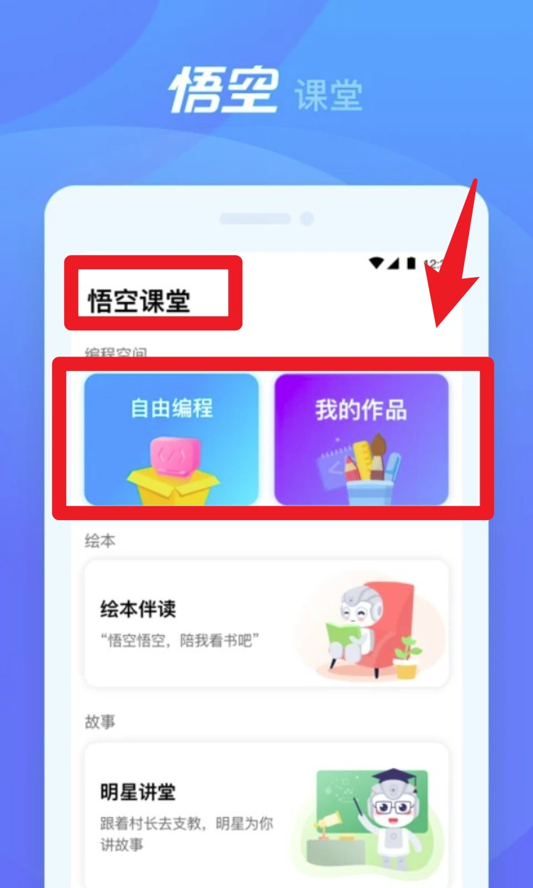 2. 在悟空课堂中点选自由编程或我的作品,孩子可进行简单逻辑搭建,也能上传自己的语音或图片进行创意展示。