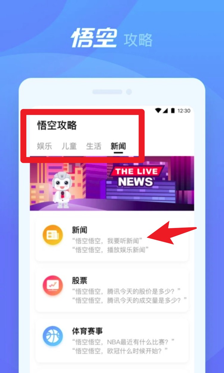 3. 前往悟空攻略版块,切换到新闻标签后,即可通过语音指令播放今日新闻、体育赛事等资讯内容,边听边学。