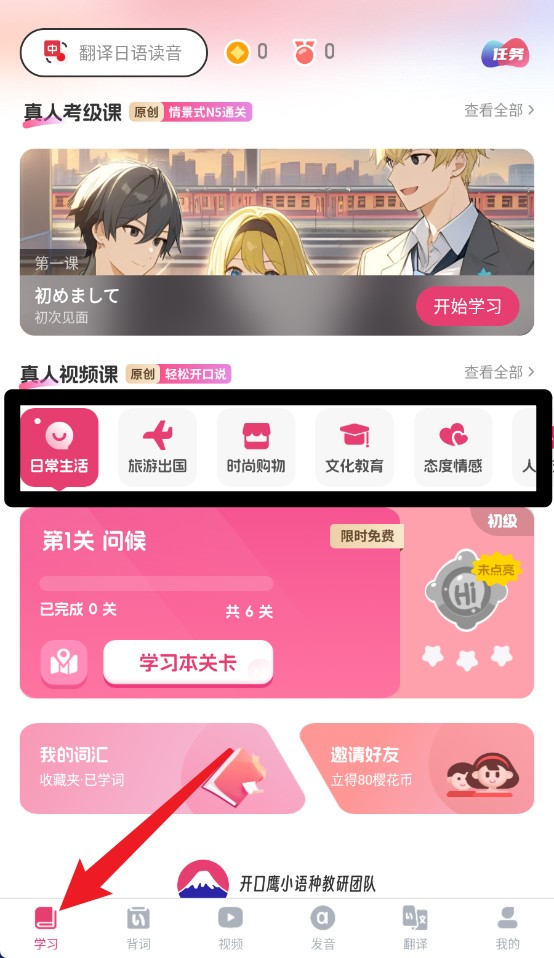 1、点击底部学习图标可进入日常生活关卡,选择分类主题课程开启互动式日语学习。