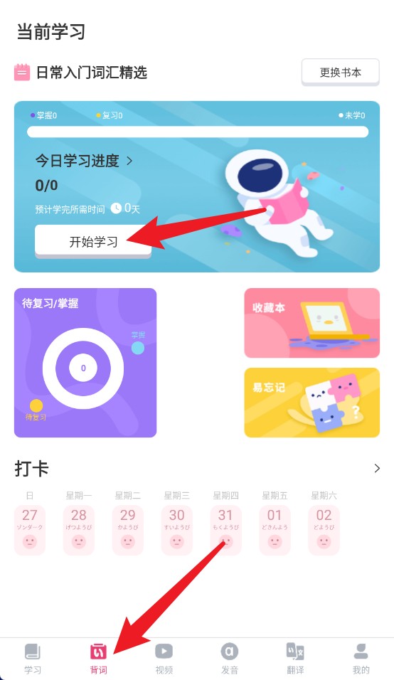 2、点击下方背词图标进入词汇学习页,可查看每日进度并点击开始学习正式背词。