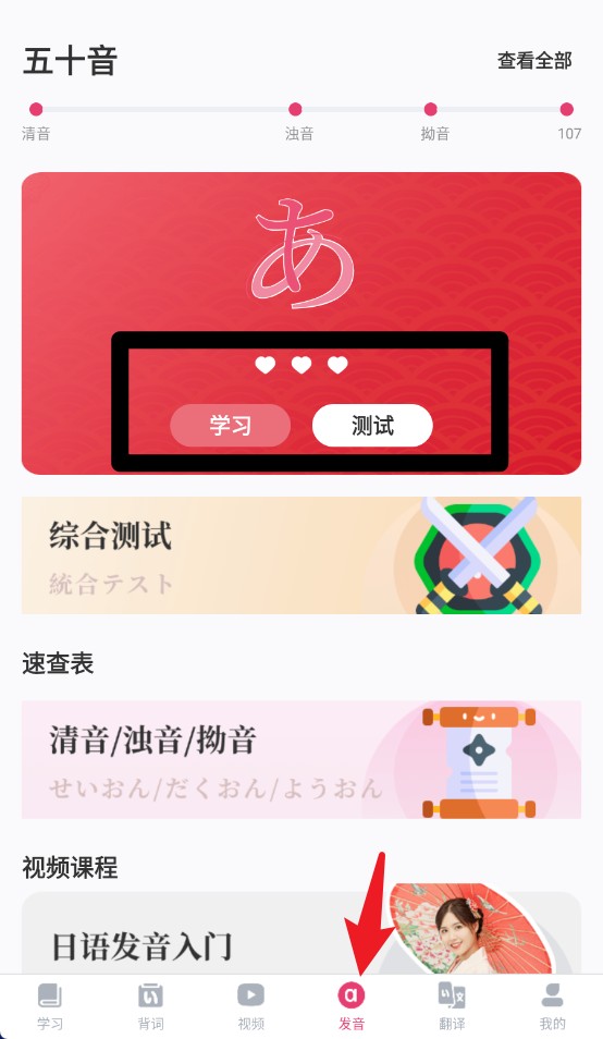 3、在五十音学习页面中,可选择学习或测试模式,加强清音、浊音与拗音的听写训练。