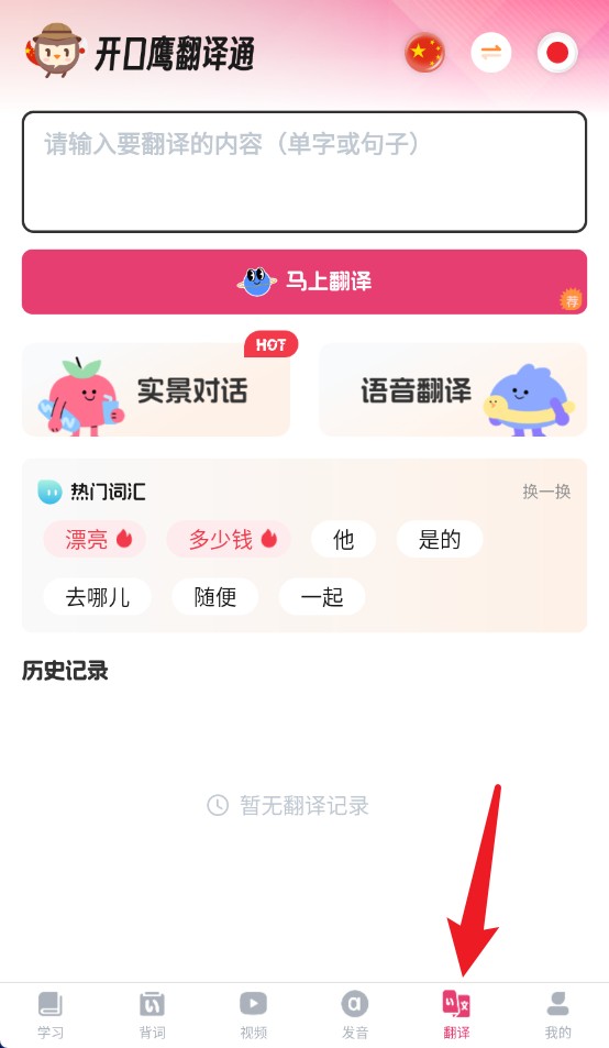 4、点击底部翻译按钮可进入翻译页面,支持文本与语音输入,满足不同情境下翻译需求。
