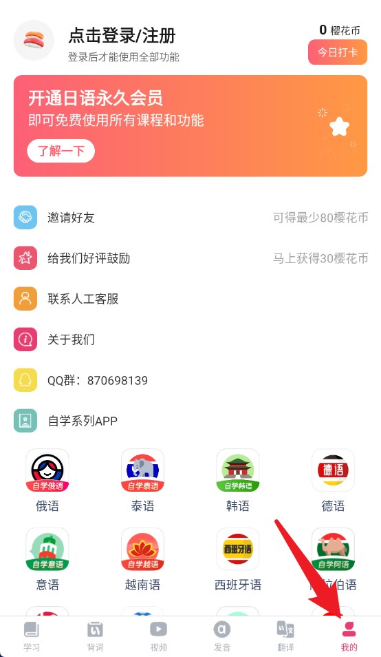 5、进入我的页面可查看账号信息、联系客服、评价反馈及探索其他语种学习工具。
