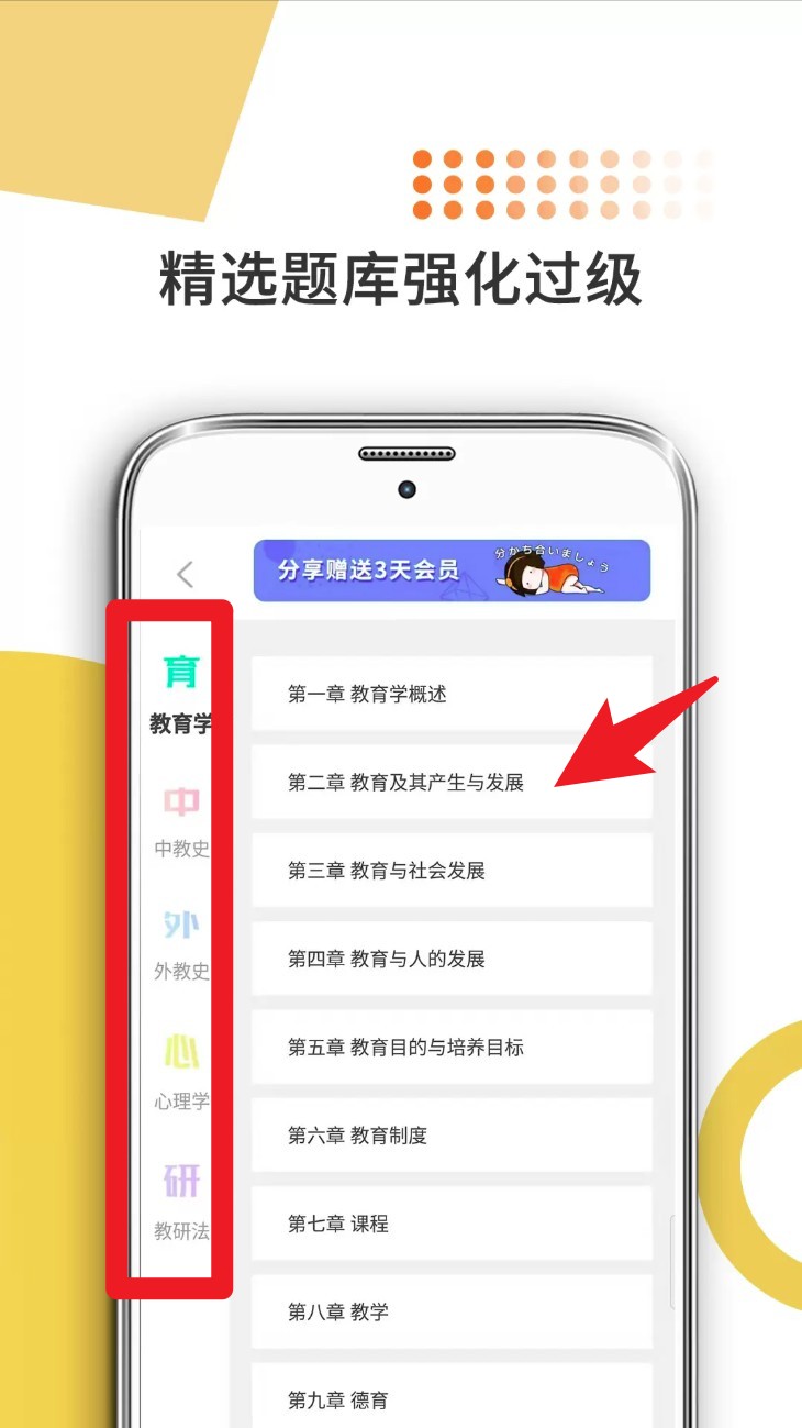 2. 登录成功后,在首页点击教育学考研模块,进入各章节的题库练习界面。