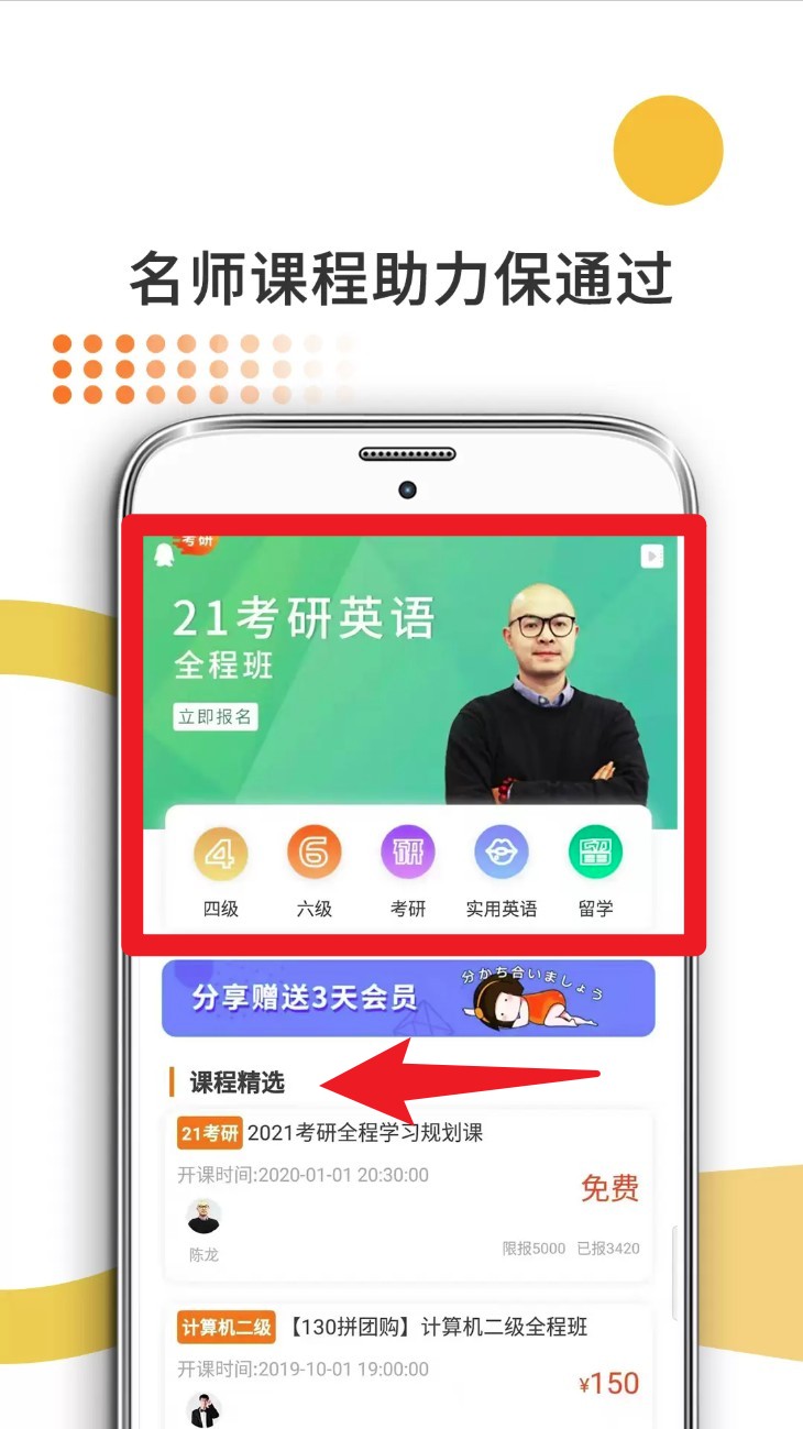 4. 返回首页,点击考研课程,可查看老师授课班级与热门付费课程内容。
