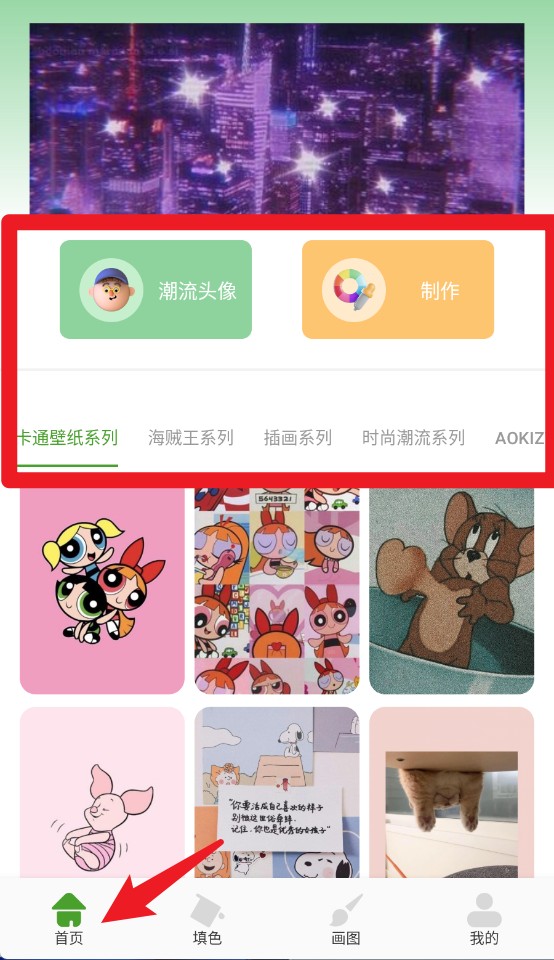 1、点击首页图标可进入卡通壁纸系列专区,包含潮流头像、插画壁纸与时尚分类。