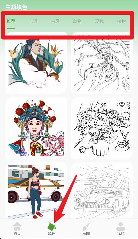 2、点击填色图标可浏览各种主题线稿,涵盖卡通、古风、动物等丰富内容。