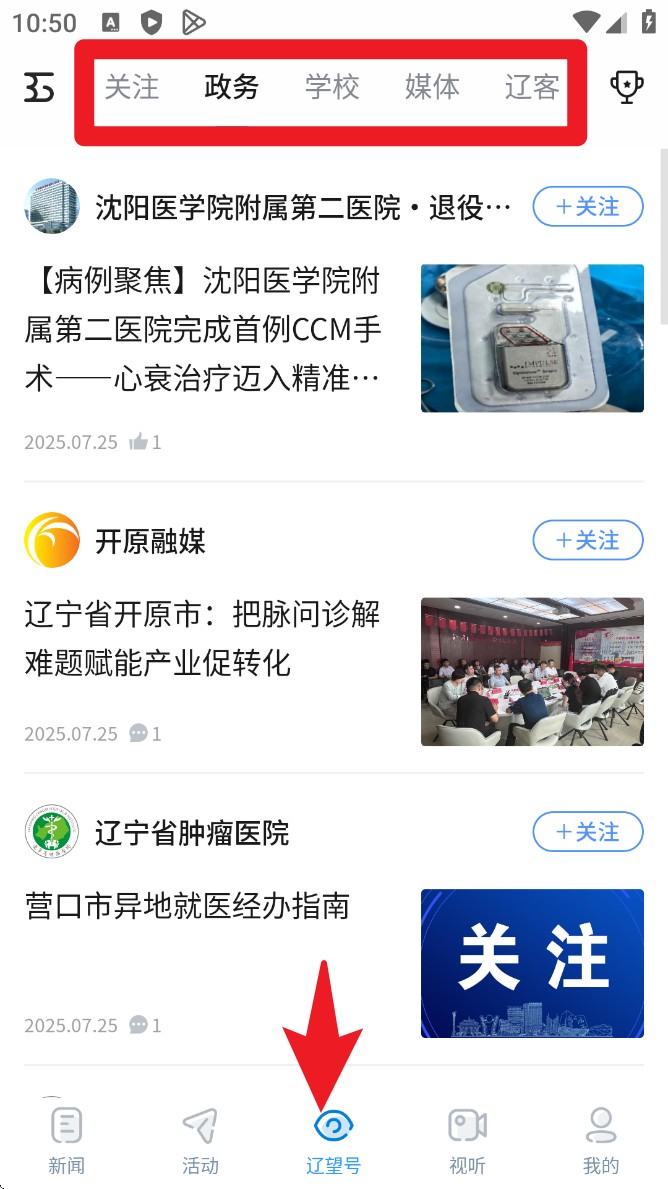 3. 点击下方辽望号进入内容发布平台,可浏览医院、政务、学校等入驻账号发布的权威信息,支持一键关注。