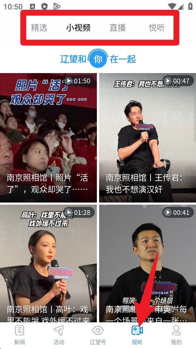 4. 切换至视听页可查看精选视频、小视频与直播栏目,内容涵盖热点话题、纪实短片、现场报道等多种形式。