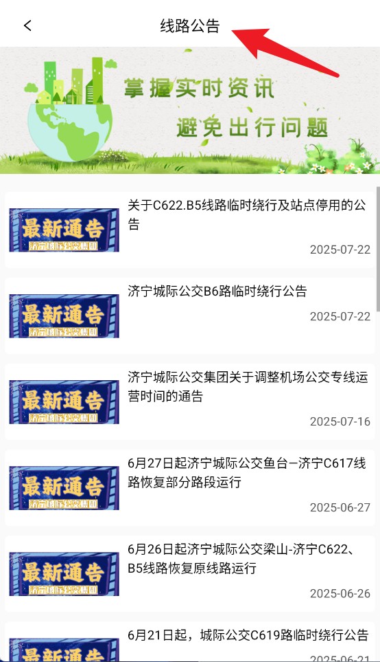 2、线路公告板块及时发布公交临时调整与运营通知,助用户规避线路变化带来的出行影响。