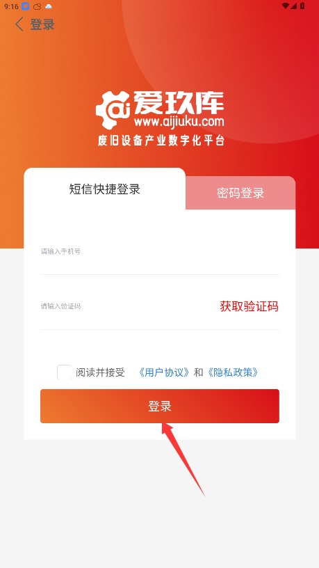 3、输入注册手机号并填写收到的验证码,勾选服务协议后点击登录完成登录流程。