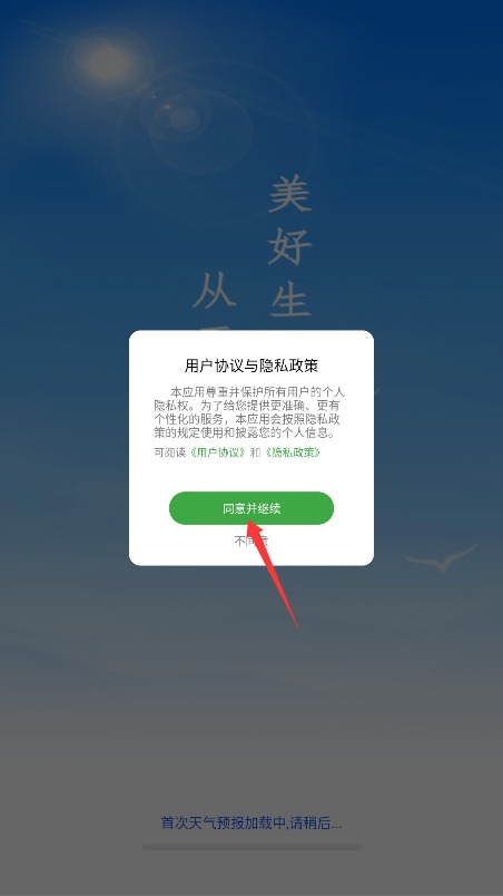 1、初次使用需阅读平台服务条款与隐私政策,确认后点击同意并继续进入应用。