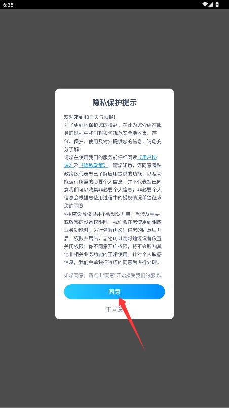1、初次使用需阅读平台服务条款与隐私政策,确认后点击同意按钮进入应用。