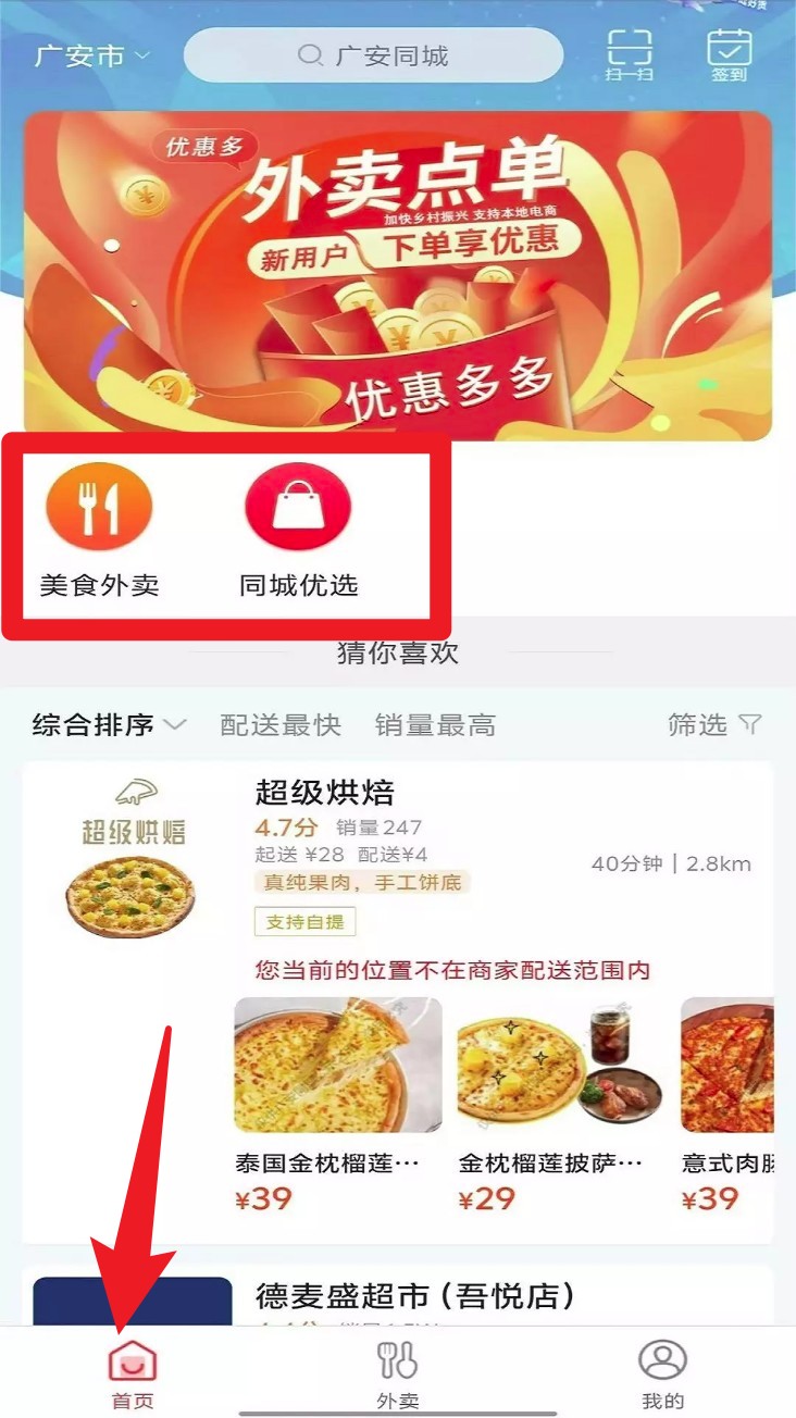 1. 进入首页后,点击上方美食外卖或同城优选,即可查看外卖推荐与本地商品清单。