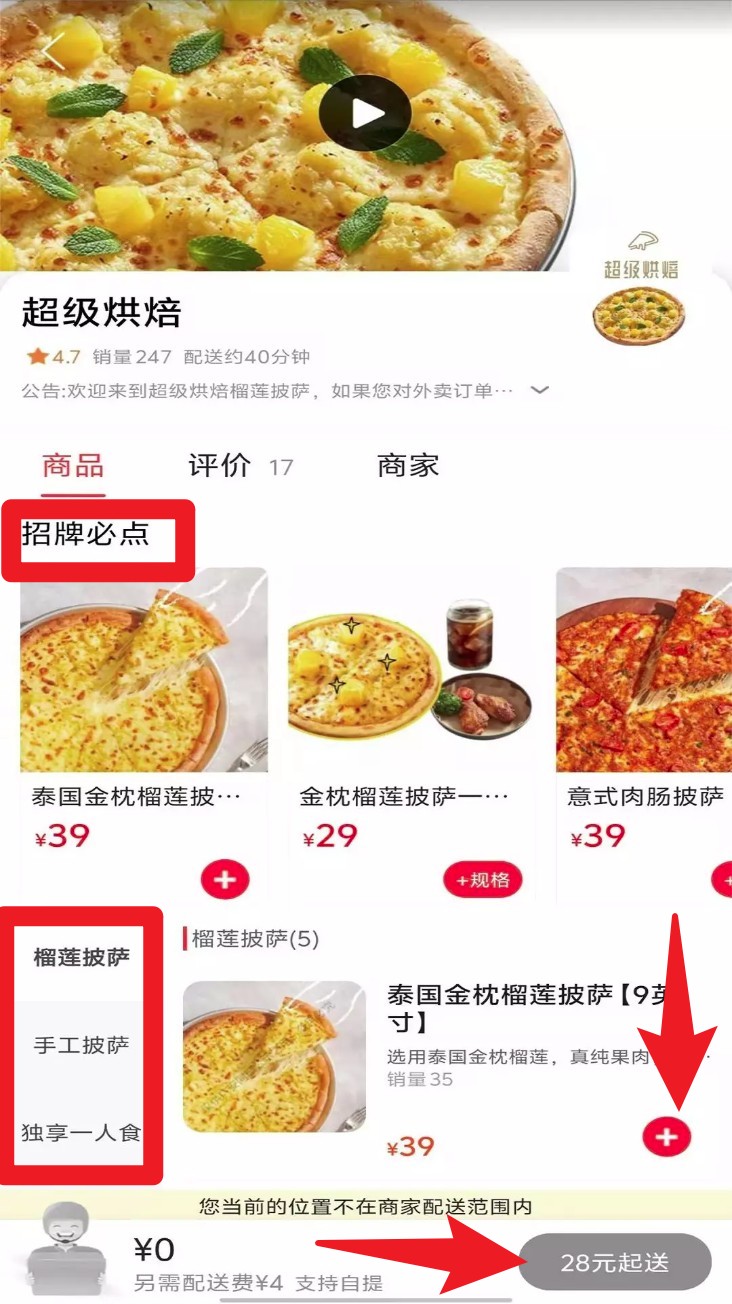 3. 浏览商品时,点击右下角+按钮将其加入购物车,底部显示配送费与起送价,支持自提选项。