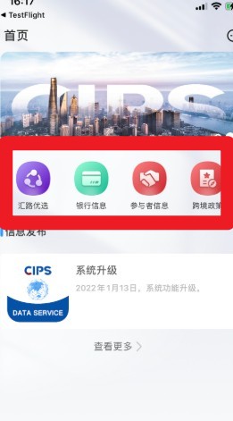 1. 首页功能区包含汇路、银行、参与者与政策信息,点选图标快速进入。