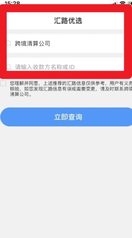 2. 在首页点击汇路优选按钮,输入收款方信息后点击立即查询。