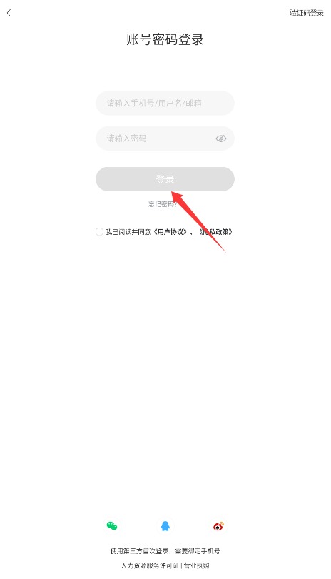 1、使用注册手机号、用户名或邮箱配合密码登录,勾选同意用户协议后进入。