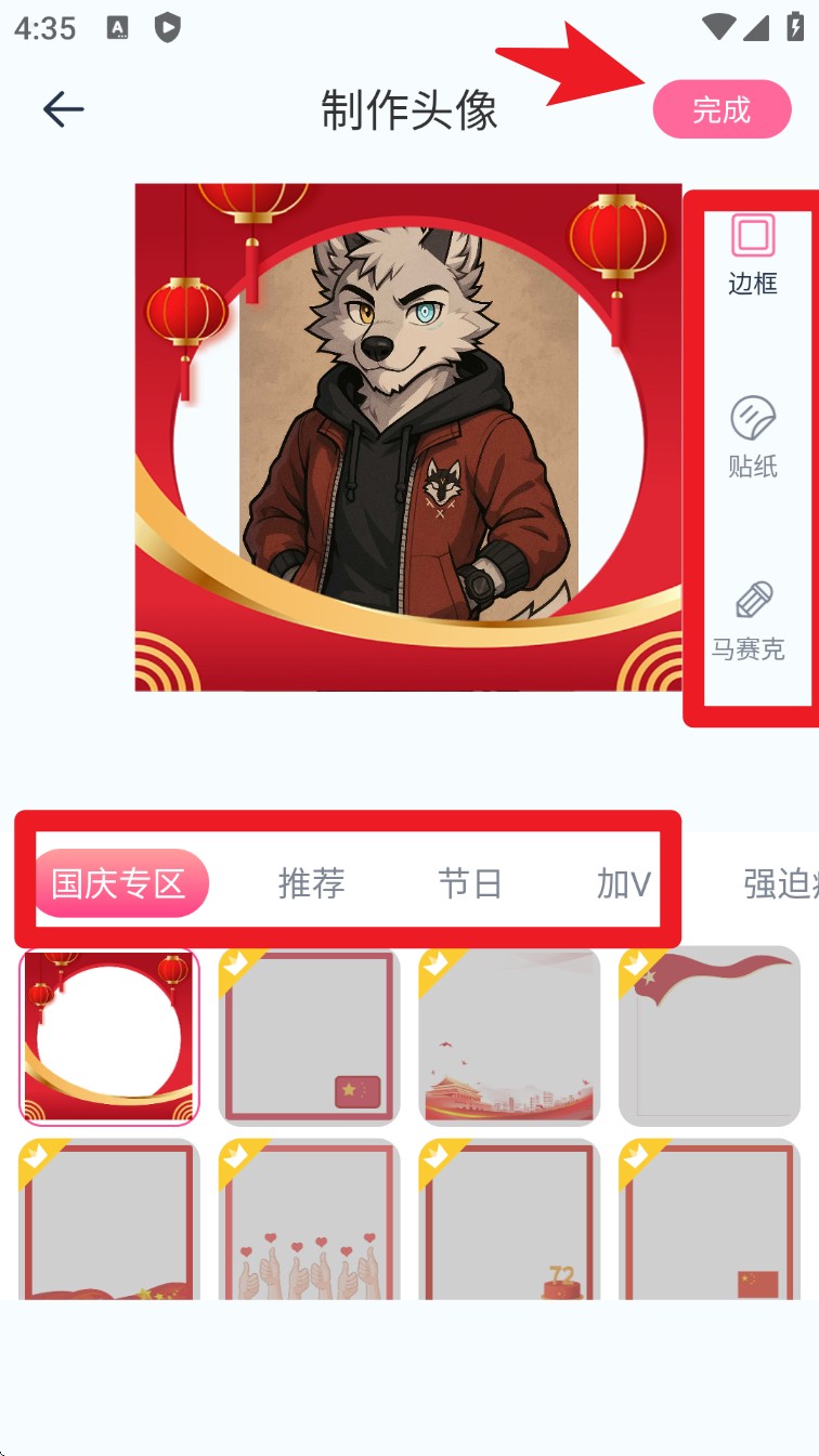4. 进入DIY制作页后,可添加边框、贴纸、马赛克等元素,选择不同分类如国庆专区、节日等增强头像风格。