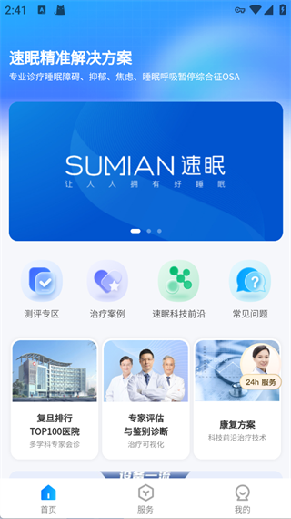 1、首页:提供速眠精准解决方案,涵盖测评、案例、科技前沿、常见问题,还有医院、专家、康复方案等睡眠健康服务入口;