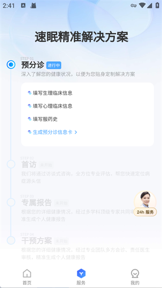 2、服务:通过预分诊、首访、专属报告、干预方案为用户定制睡眠健康解决方案,且配备 24 小时客服随时响应需求;
