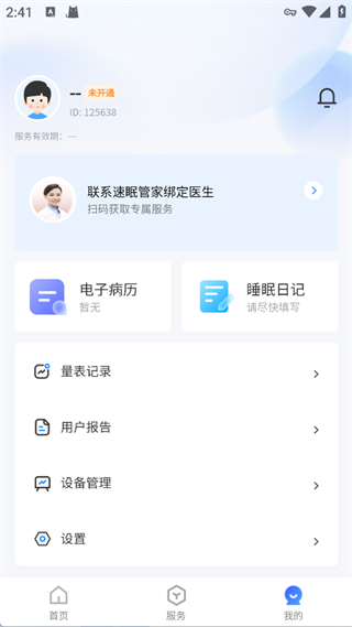 3、我的:提供绑定医生、电子病历、睡眠日记、量表记录、用户报告、设备管理及设置等个人睡眠健康管理功能。