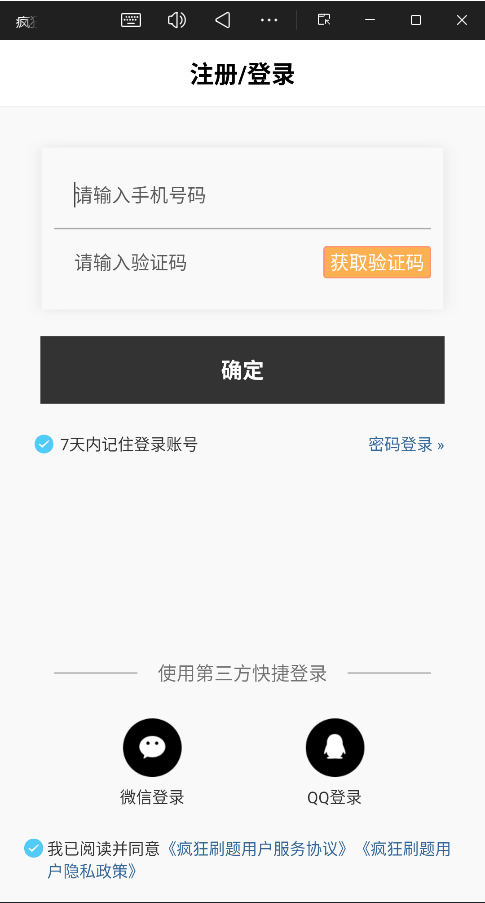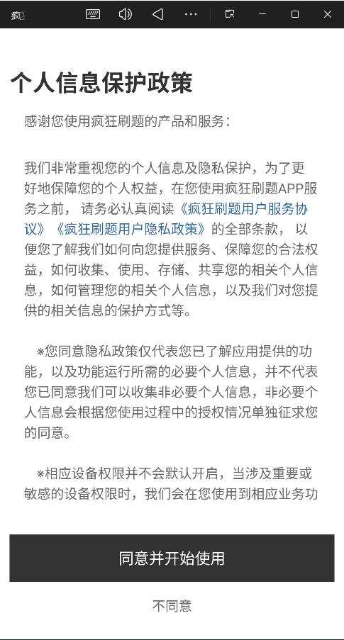 仔细阅读《疯狂刷题用户服务协议》和《疯狂刷题用户隐私政策》