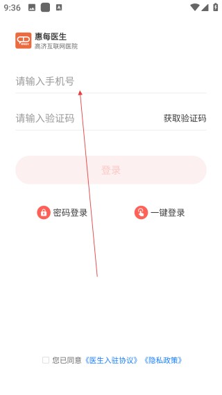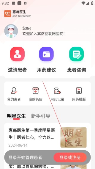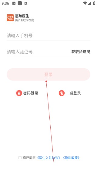 1、打开惠每医生 APP,找到【登录或注册】按钮并点击进入。