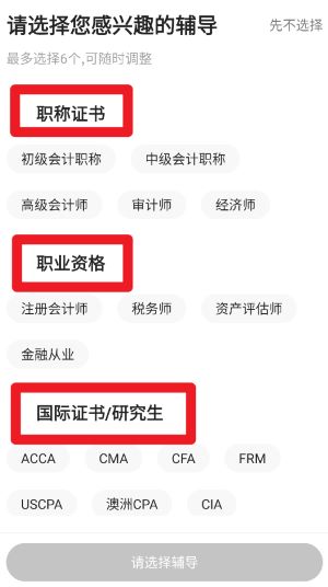 1、首次进入时可选择自己感兴趣的考试项目类别,包括职称证书、职业资格和国际认证,最多可选六项。
